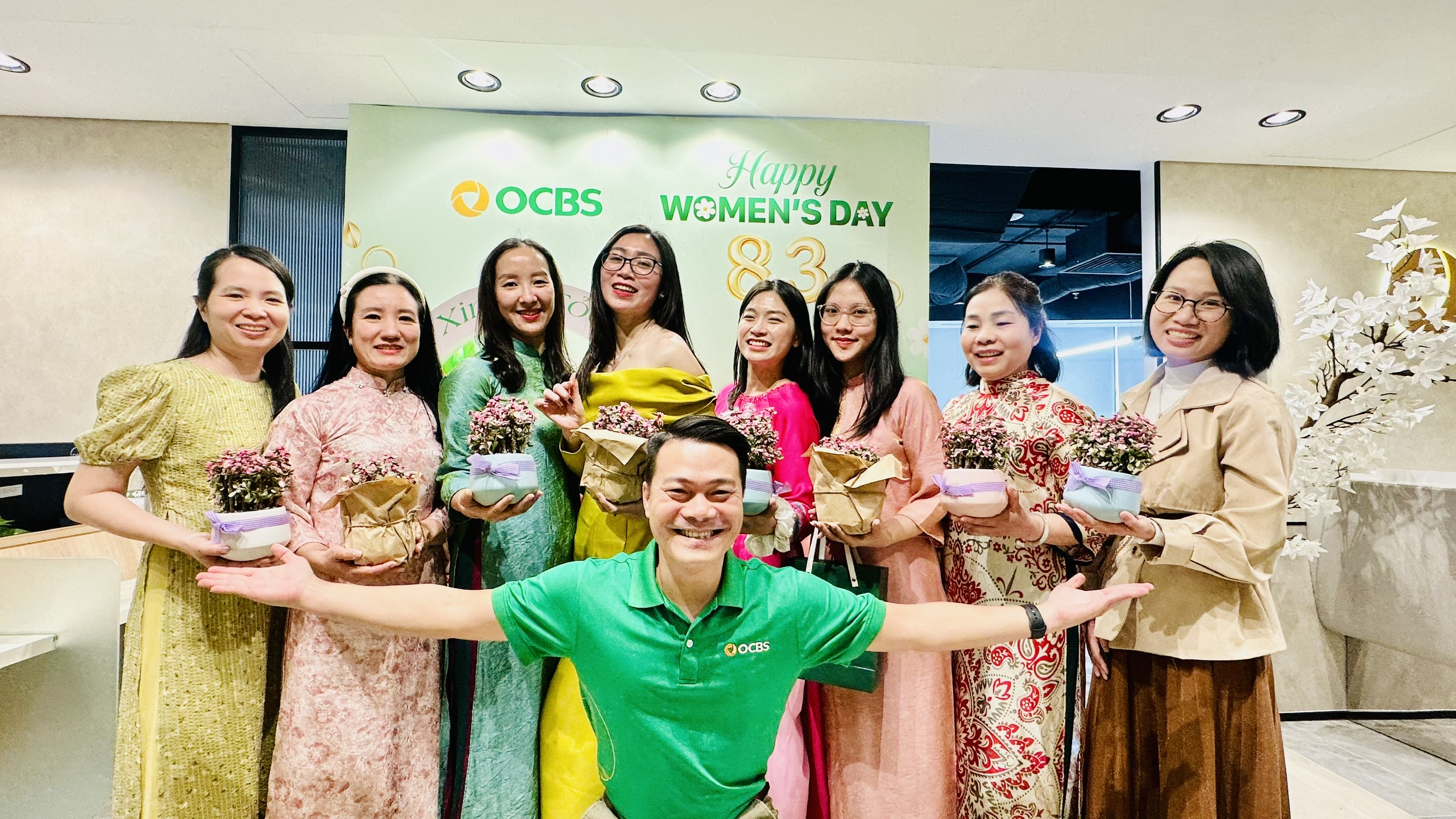 Không gian ngập tràn sắc trắng – hồng – xanh, nơi các Chị Em OCBS rạng rỡ trong những bộ trang phục tươi tắn, tự tin tỏa sáng theo cách riêng của mình. Từ những tà áo dài thướt tha đến những bộ đầm hiện đại, mỗi góc nhỏ văn phòng đều trở thành background "sống ảo" cực chất với những nụ cười hạnh phúc.